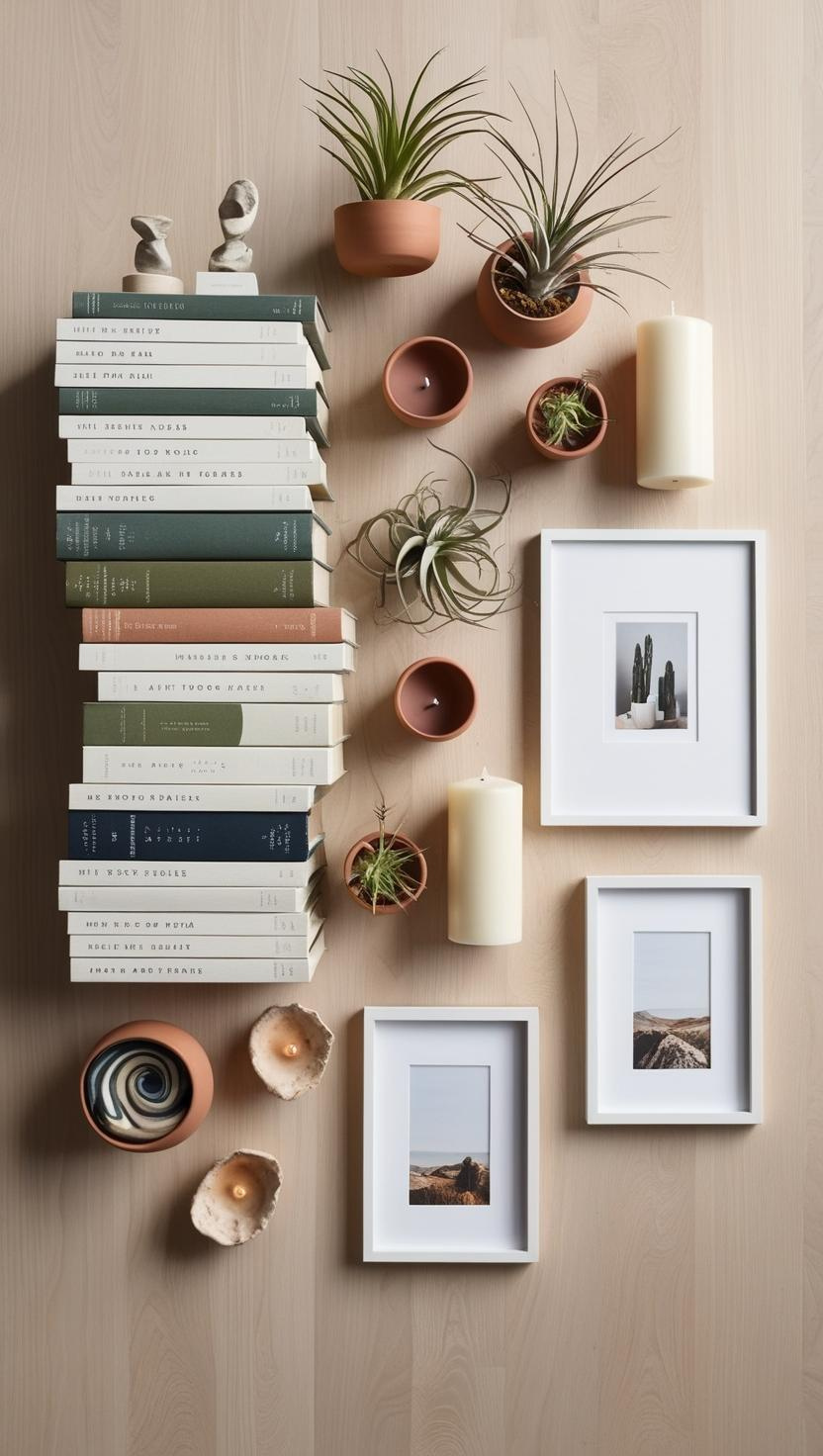Make sure to mix objects of different heights and sizes. Don’t place tiny decor pieces alone on a large, empty shelf. Use stacks of books or decorative boxes to elevate smaller pieces.