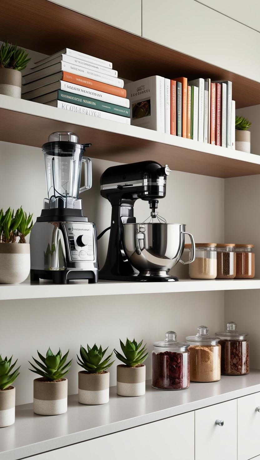 • In the Kitchen: Use shelves to organize small appliances like a blender, stand mixer, and juicer, along with your favorite cookbooks.
