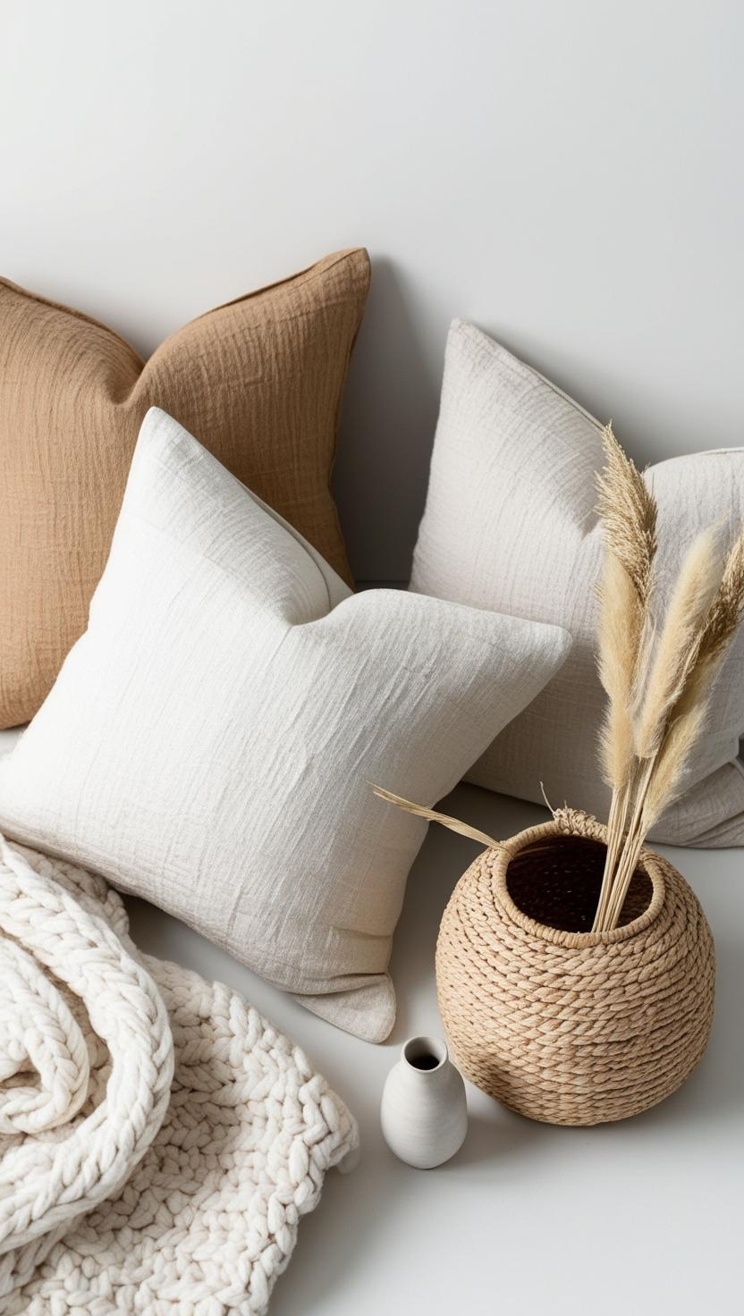 • Use natural elements like plants, woven baskets, or stone pieces.