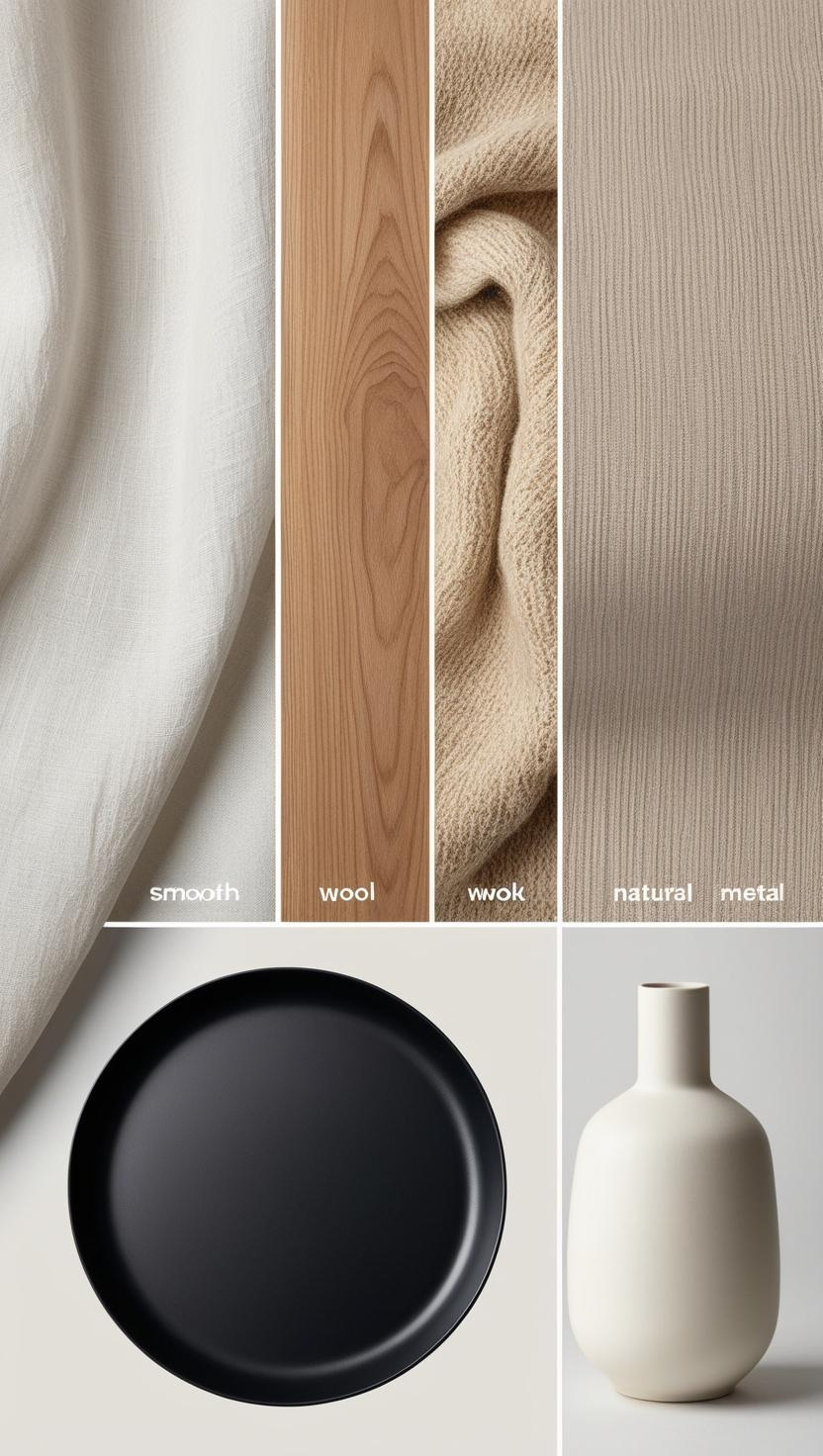 • Layer different materials: wood, linen, ceramics, leather, glass.